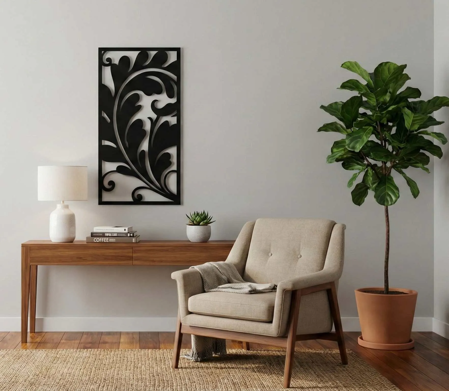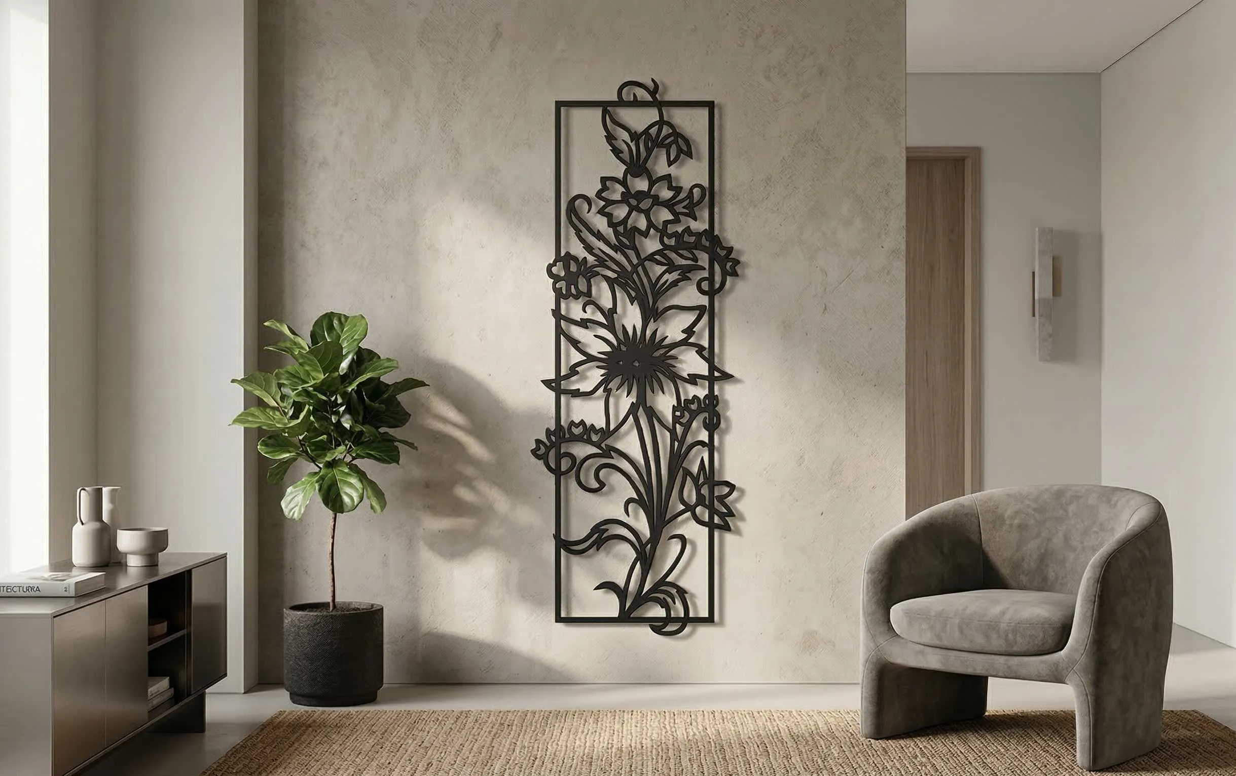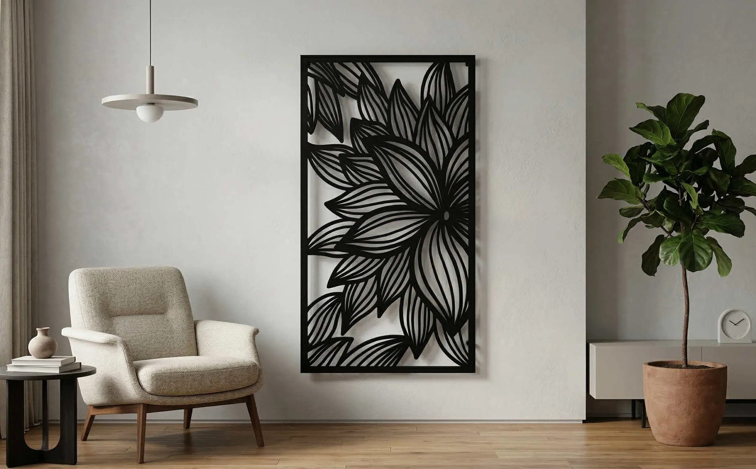 Precision laser cut metal wall art decor panels in geometric, botanical, and abstract patterns. Ready-made in standard sizes for immediate order, or customisable on enquiry.